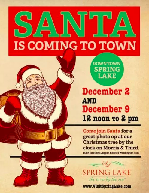 Join us in downtown Spring Lake at the clock and Christmas tree on Morris & Third Ave to visit with Santa! Santa will be seated in front of our Huge town Christmas tree and ready to take photos and have your children sit on his lap!