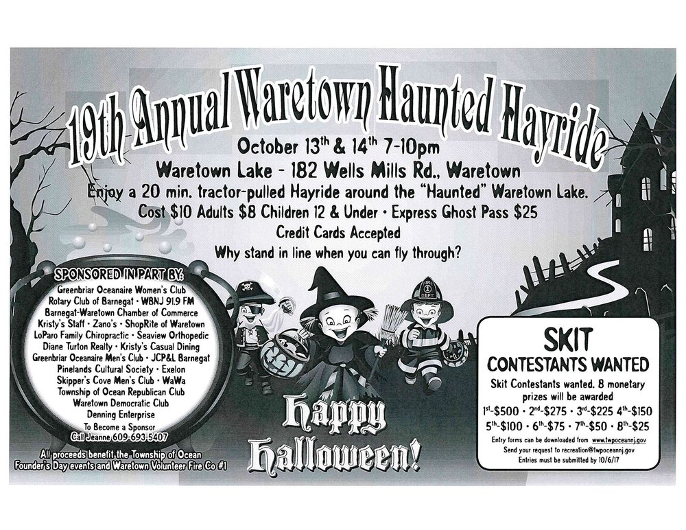 22nd Annual Waretown Haunted Hayride sponsored by the Township of Ocean and Waretown Vol. Fire Co. 20 Min. tractor ride around the “Haunted” Waretown Lake Last year over 3600 paid participants attended this event Food and beverages will be available for purchase. VOLUNTEERS ARE WANTED: SKIT CONTESTANTS ARE WANTED: For more info call Jeanne 609-548-6319 or email recreation@twpoceannj.gov